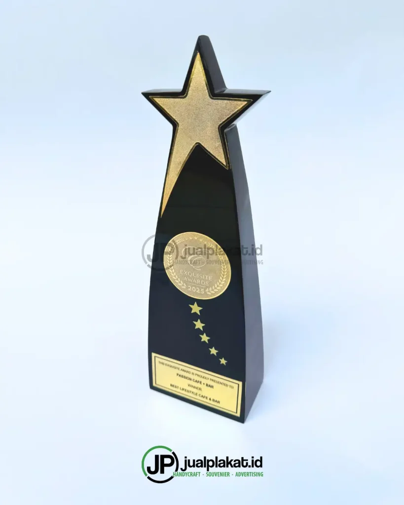 Plakat Kayu Exquisite Awards 2025 dengan desain elegan dan detail presisi, mencerminkan simbol prestasi dan profesionalisme.